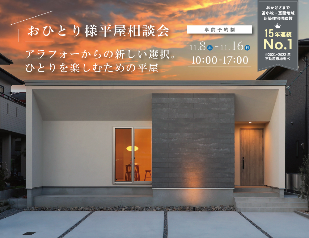 【相談会開催】アラフォー世代の方が自由でちょうどいい暮らしを叶える、おひとり様向けコンパクト平屋相談会|11/8(土)-11/16(日)日吉町本社にて開催!
