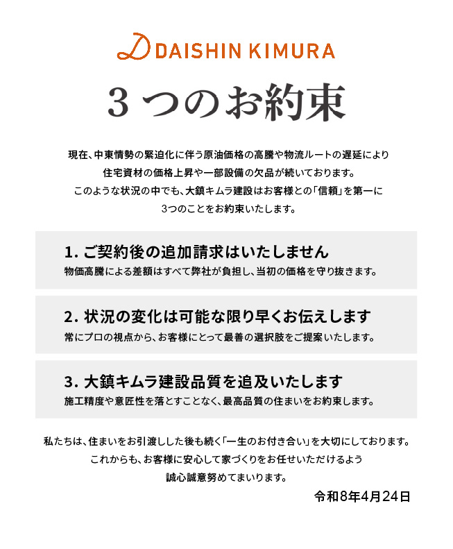 陽春の候、皆様におかれましては益々ご清祥のこととお慶び申し上げます。 また、日頃より私共「大鎮キムラ建設株式会社」を信頼し、大切な住まいづくりをお任せいただいておりますこと、心より厚く御礼申し上げます。さて、すでにご報道等でご存知の通り、現在の中東情勢緊迫化に伴い、世界規模での物流混乱と原油価格の高騰が続いております。これを受け、住宅業界全体においても資材の調達が極めて困難な局面を迎えております。 現在、弊社にて建築中、および着工を控えていらっしゃるすべてのお客様へ、現状の正しいご報告と私共の姿勢をお伝えしたく、本状を送付させていただきます。